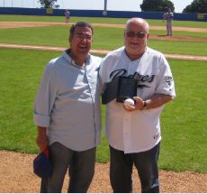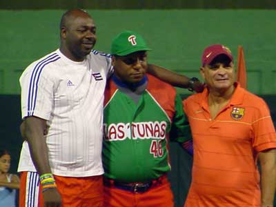 Padilla y Manrique pasado y presente del béisbol cubano han pasado por Barcelona. Triunfaron como jugadores en la Selección Cubana y ahora imparten su magisterio en Italia. En la foto con Ángel Aguado y Josep Juaneda. |