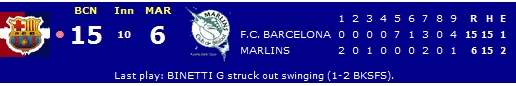 En el primer partido Victoria del Barça 2-8 con una grandísima actuación de Jason Friedman que lanzó 7 entradas sin permitir un sólo hit hasta recibir un home run en la 8ª. Sustituido muy bien por Delio Martínez que cerró el partido. Al bate han destacado, Orlando Diaz con 3hits (1 HR), Albert Diaz (3h) Rafa Llames y Sergio Román (2h) |